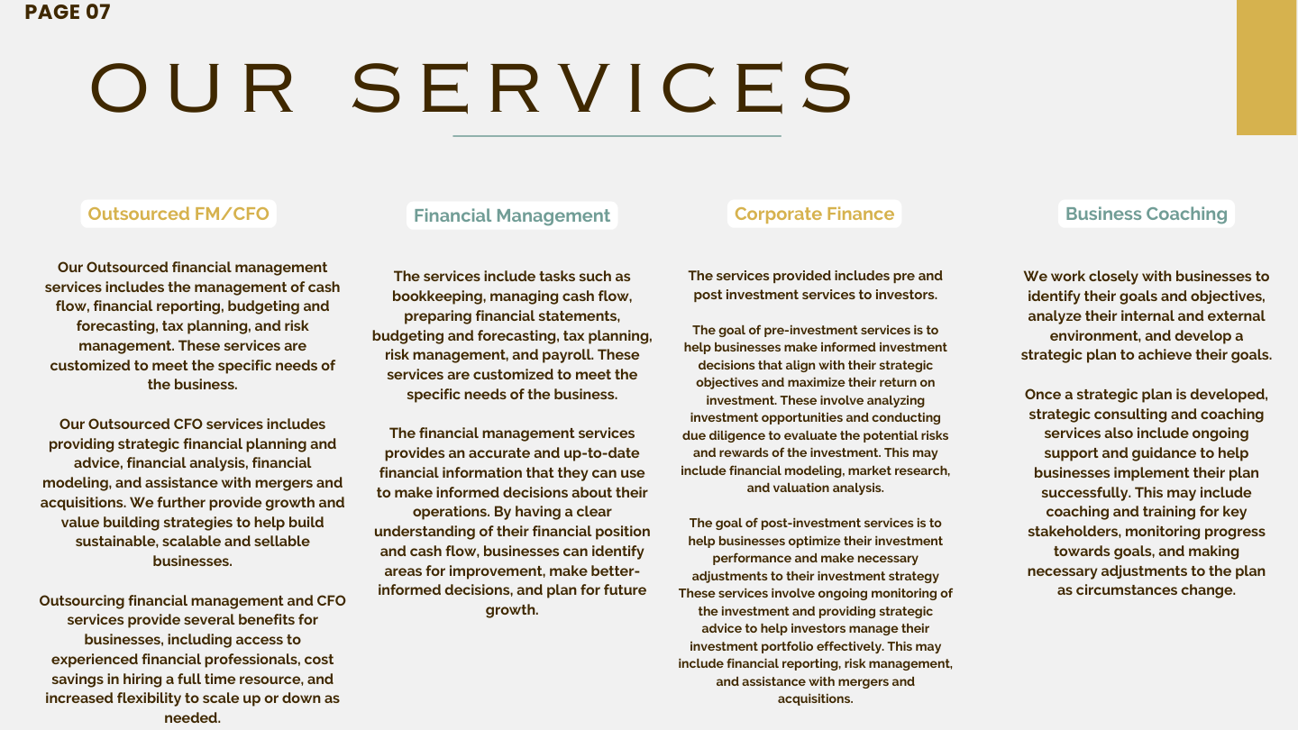 Our team has experience in Accounting, Taxation, Corporate Finance, Strategic Financial Planning, Fund & Investment Management, hence they can provide sound results-driven Financial Planning solutions.