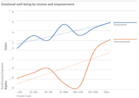 To demonstrate the evidence, the graph below compares people who feel empowered by their finances with people who don’t. It shows empowered people had mostly positive experiences with their finances, even in the lowest income ranges. Those who felt disempowered were less happy than their peers and didn’t reach the positive range until their annual earnings were well above $100,000 (US-based stats).